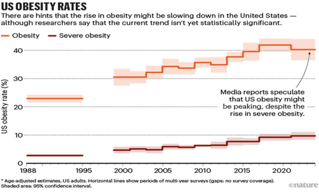 It might have already started. In the United States, where 12% of adults say that they have at some stage taken GLP-1 agonists for diabetes or weight loss (see ‘Uptake of GLP-1 drugs in the United States’), media reports suggest that obesity rates are falling, although scientists caution that the data are not statistically significant (see ‘US obesity rates’). Slowing or reversing obesity trends more widely — more than half of the world’s population is expected to be overweight or have obesity by 2035 — would have myriad ripple effects. “The spillover impacts of obesity are enormous,” says Alison Sexton Ward, an economist at the University of Southern California in Los Angeles.
