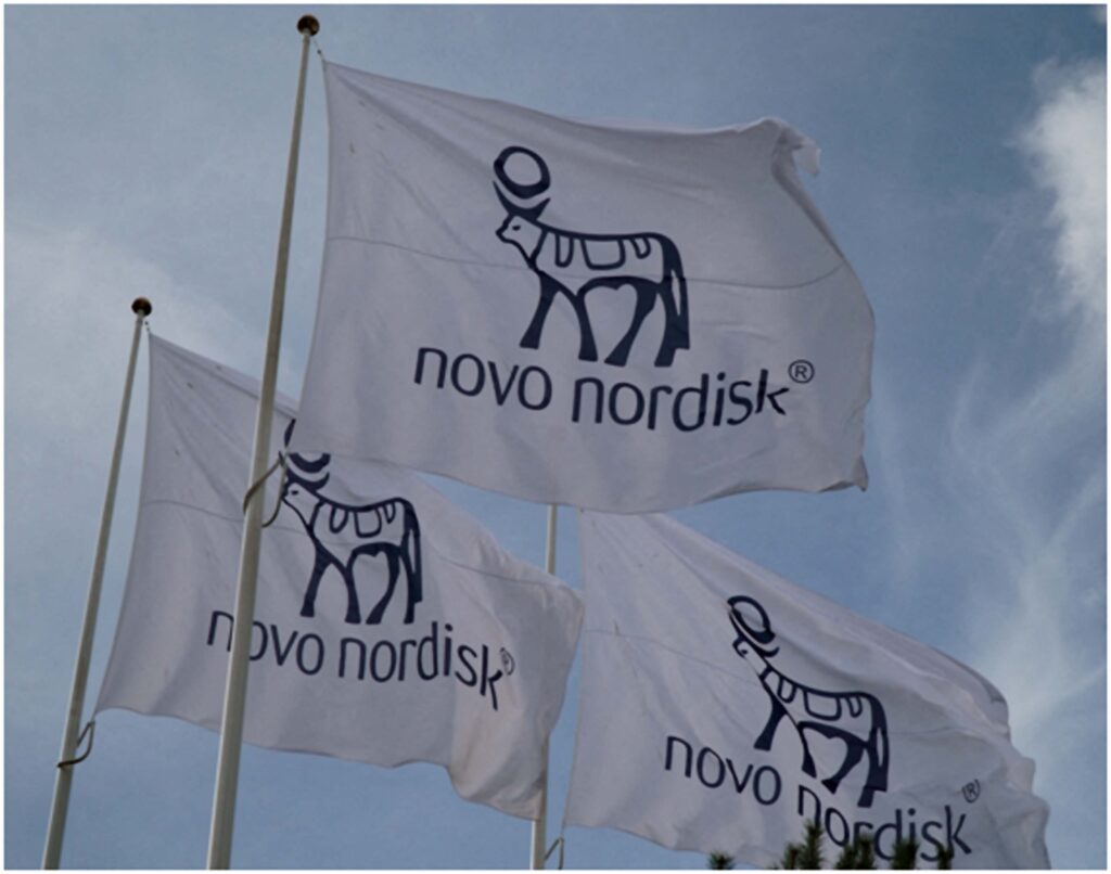 Flags with the Novo Nordisk logo flutter outside their Danish company’s offices in Copenhagen, Denmark. REUTERS/Tom Little/File Photo